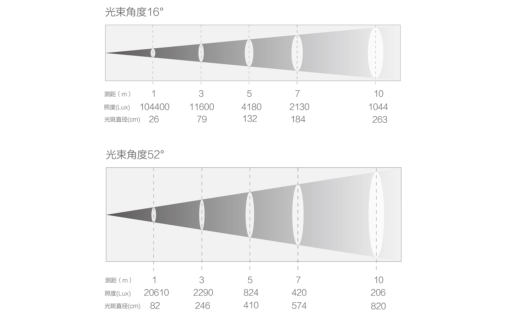 射距,光斑直徑與照度: