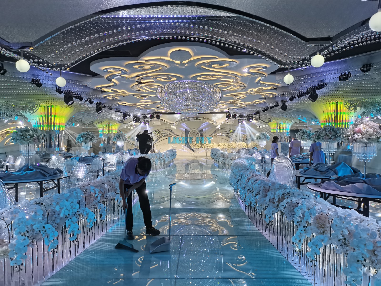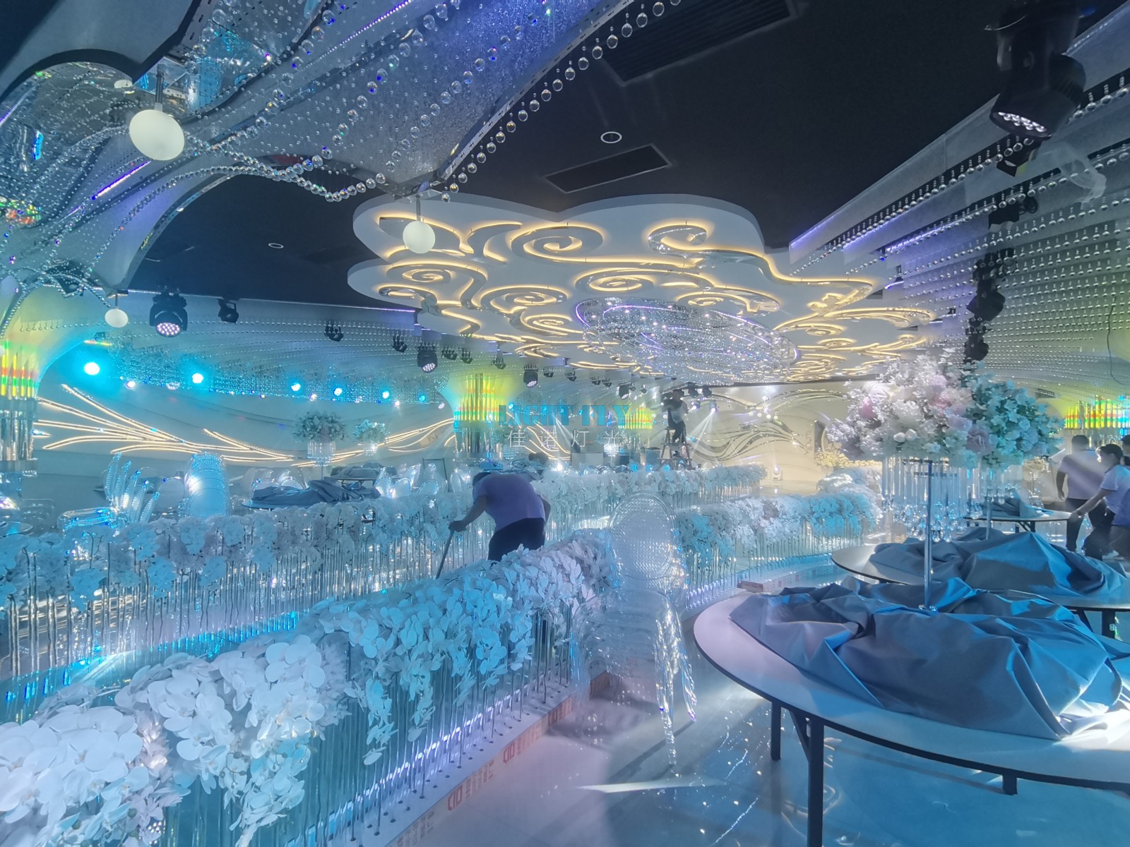 三個(gè)宴會(huì)廳分別為水晶燈光宴會(huì)廳,時(shí)光燈光宴會(huì)廳,錦熙燈光宴會(huì)廳,每個(gè)宴會(huì)廳燈光都由佳諾燈光設(shè)計(jì)師設(shè)計(jì)水晶廳以水晶燈為主,LED染色帕燈為輔配合LED面光燈實(shí)現(xiàn)七彩換色與色溫切換,380W白色光束燈實(shí)現(xiàn)整個(gè)宴會(huì)廳光束與棱鏡效果。時(shí)光廳增加了LED全彩升降球燈色彩實(shí)現(xiàn)七彩升降球動(dòng)感升降效果,讓宴會(huì)廳更加多姿做菜,錦熙宴會(huì)廳燈光用380W圖案燈配合光束燈實(shí)現(xiàn)圖案與光束的變換,配合一體智能燈光控制實(shí)現(xiàn)美輪美奐宴會(huì)廳燈光秀。