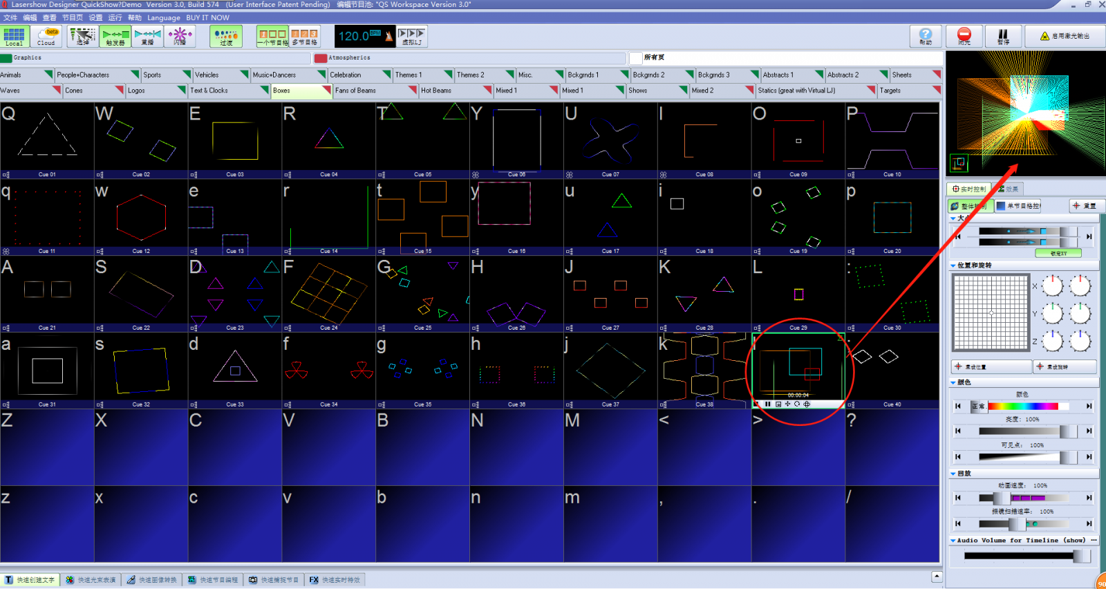 對于一般激光表演,你幾乎可以開箱即用。你所需要做的只是點(diǎn)點(diǎn)鼠標(biāo)或者敲敲鍵盤,根據(jù)音樂隨意播放節(jié)目。Quickshow自帶近2000個(gè)圖形、動(dòng)畫、光束和節(jié)目,完全可以滿足你的一般需要。