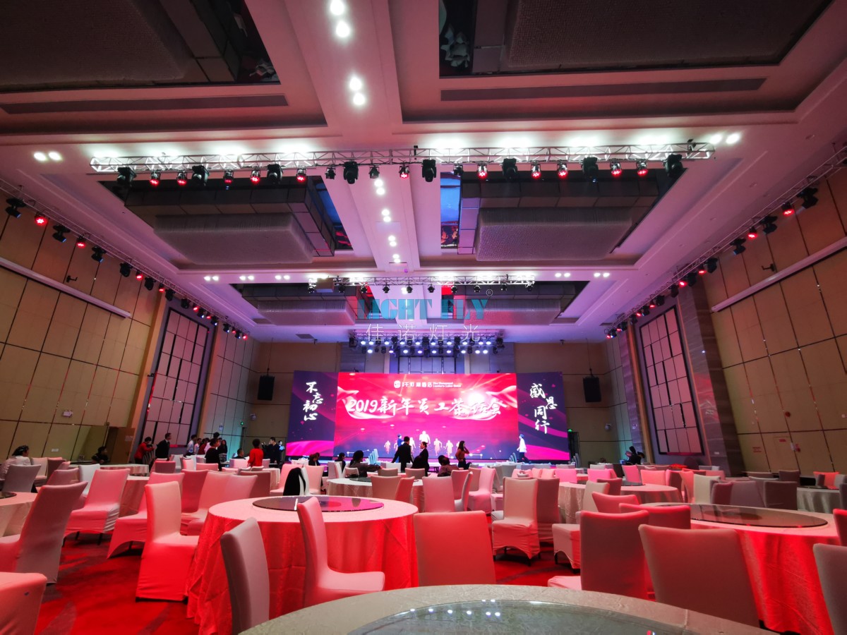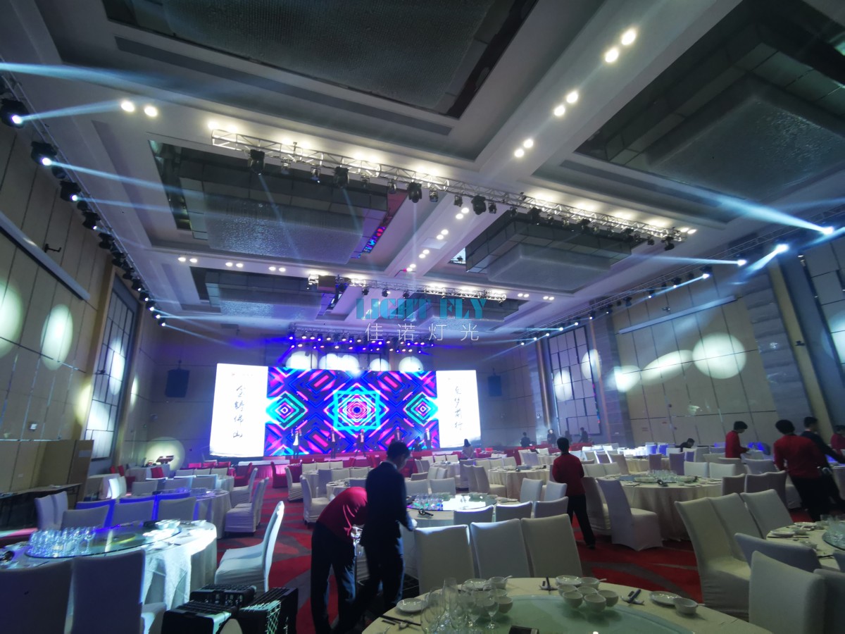 千燈湖酒店宴會(huì)廳整個(gè)大廳高度達(dá)到10米,佳諾燈光LIGHT FLY為酒店宴會(huì)廳主要設(shè)計(jì)左右兩道側(cè)光:光束燈+LED帕燈各20臺(tái)鋪光左右兩邊。主舞臺(tái)設(shè)計(jì)了三道頂光+一道面光:380W光束圖案燈+LED染色帕燈,LED面光采用最新的4X50W四眼LED面光燈,舞臺(tái)后面還配備了一臺(tái)30W全彩動(dòng)畫(huà)激光燈打造美輪美奐的激光秀,絢麗的燈光秀得到了酒店領(lǐng)導(dǎo)的一致滿(mǎn)意。